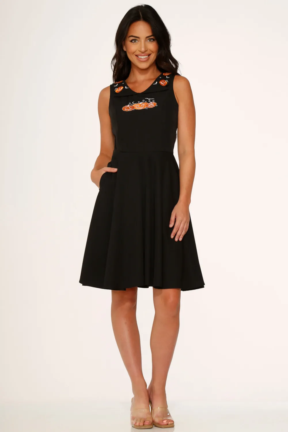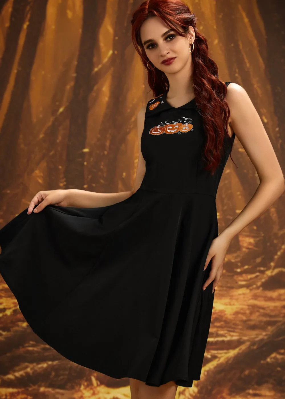 Get ready to carve out some serious style this spooky season with the Orchid Bloom Halloween Pumpkin Embroidery Swing Dress! This playful yet sophisticated piece features adorable pumpkin embroidery details on the collar and chest, bringing a touch of Halloween spirit to your look. The classic fit-and-flare silhouette is crafted from a comfortable cotton-spandex blend that moves effortlessly with you, while the center back zipper ensures a sleek fit. Perfect for Halloween parties, pumpkin patch adventures, or just showing off your spooky spirit all season long!