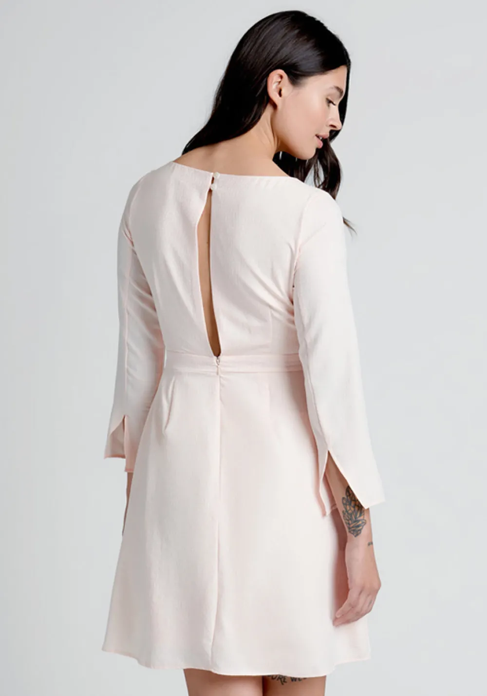 Presenting in the prettiest of pale pinks, we offer you this beautiful fit-and-flare dress from our ModCloth namesake label. Created to highlight your most special occasions, the bodice of this A-line dress features a bateau neckline with back button closure, a keyhole cut-out at the back, and ¾ sleeves with slits in the cuffs. The skirt is knee-length with thoughtfully placed darts at both hips for a figure-flattering silhouette, and boasts a vintage-inspired high-waistline. Full of subtle sweet detail, all this soft woven dress really needs to take the cake is you!