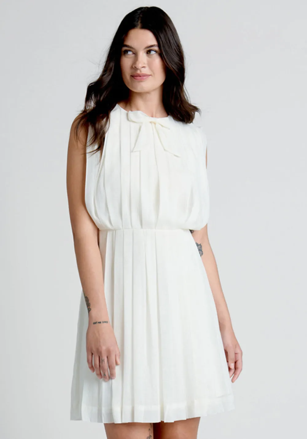 Panel after panel of perfectly sweet pleats in black recycled chiffon fabric gives this vintage-inspired mini dress a silhouette that’s hard to forget! Designed in-house exclusively for our ModCloth namesake label, this feminine sleeveless dress is illuminated by metallic silver threading throughout with a darling neck-bow detail. The waistline is cinched to be worn alone, and also looks amazing with your own pop of color from a belt or sash. Perfect for your holiday events too!