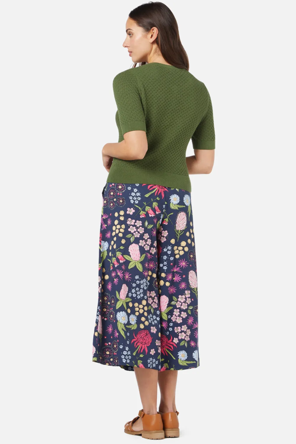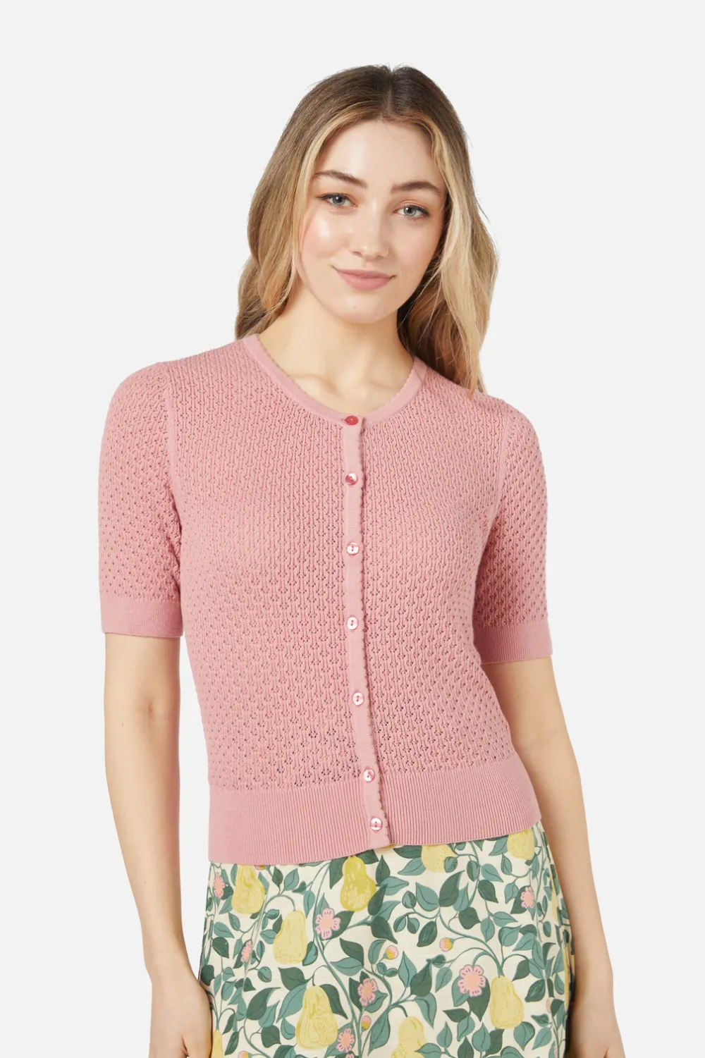 The Isla Cardi offers a charming lace-style knit in a cotton yarn, making it a breathable and versatile piece for any wardrobe. This short-sleeve cardigan features a rounded neckline, button-through front, and ribbed detailing on the neck, cuffs, and hem. Designed with a comfortable amount of stretch, it’s perfect for layering over dresses or pairing with high-waisted pants. Available in olive and pink.