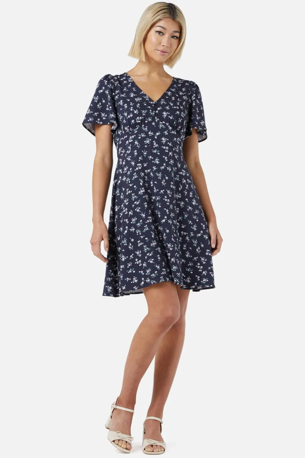 Featuring a flattering v-neckline and dreamy floaty sleeves, it’s perfect for twirling through picnics, coffee dates, or spontaneous adventures. A gentle yoke detail at the front adds charm, while thick side ties let you cinch your waist just right. The smooth skirt floats just above the knee – flirty, fun, and free-spirited.