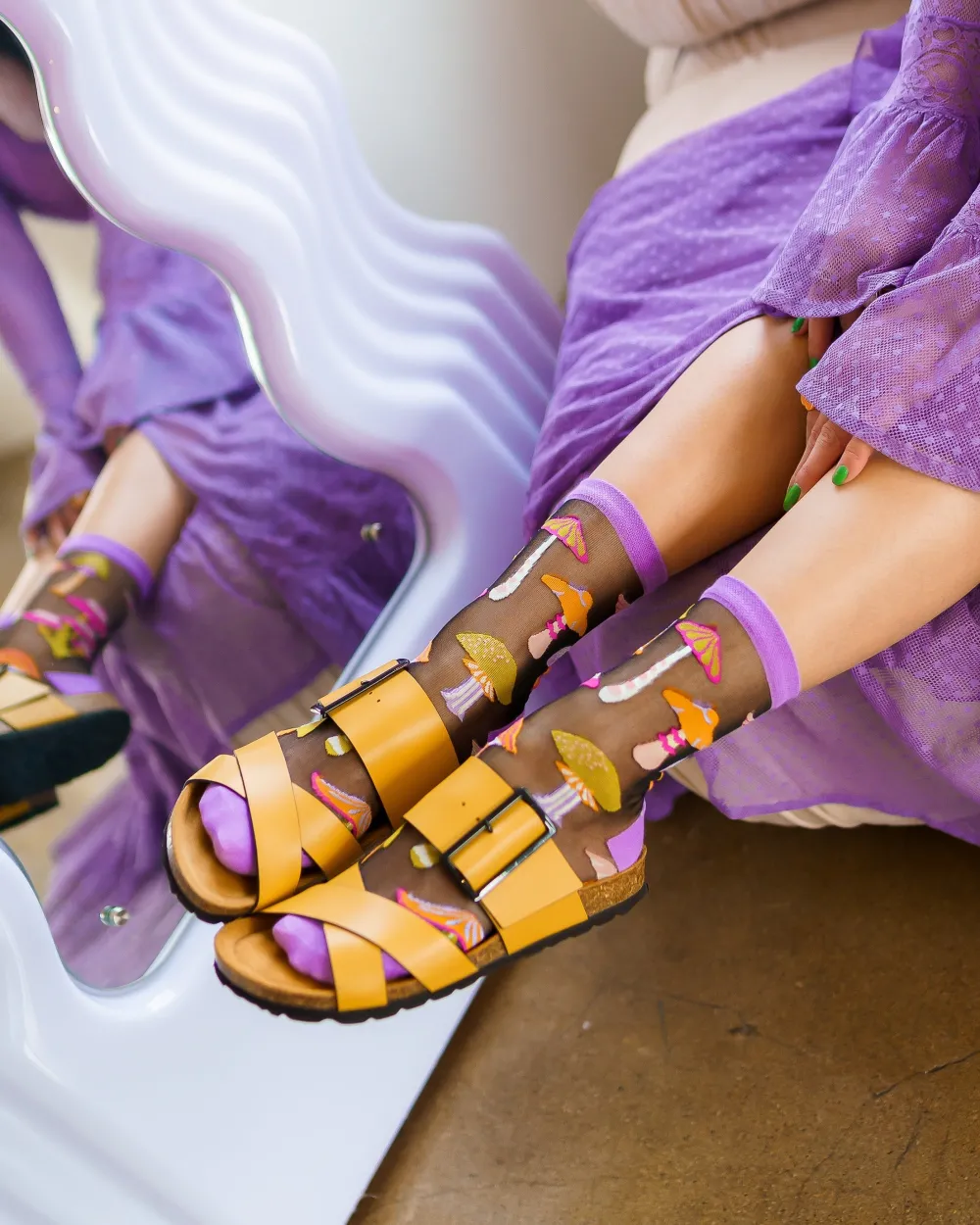 We don’t want to brag, but these are the cutest mushrooms you’ll ever wear on your feet. Channel your inner boho queen and add a dash of whimsy to your look with our mushroom socks, set against a black sheer fabric for a mysterious vibe.