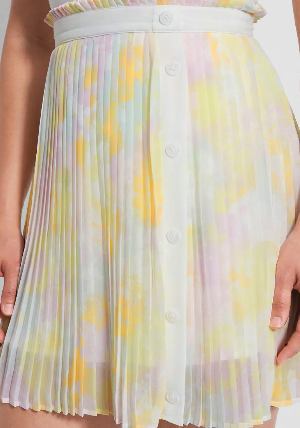 The dainty frill trim along the waistband of this darling pleated mini skirt from our ModCloth namesake label will have you feeling positively adorned! So sweet with its vintage-inspired high-waisted silhouette, this fully-lined spring and summer separate is made from a lightweight ivory-hued woven fabric covered in an exclusive watercolor-esque floral print in baby-soft hues of pink, yellow, and blue. Boasting micro-pleats all over and white accents with an off-center button-front closure, this colorful mini skirt is fun to wear, just for the sheer frill of it!