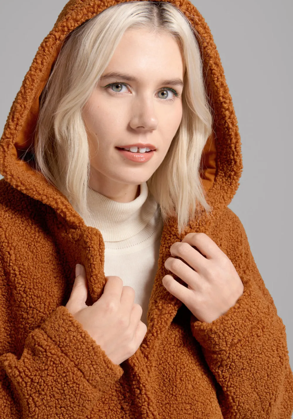 In a cinnamon-y shade of orange, this oh-so-cozy hooded jacket will keep you bundled up in retro-chic style! Made from a plush sherpa fabric and boasting front snap-button closure, handy front patch pockets, long sleeves, and a snuggly hood, this adorable, fully-lined teddy coat will become the outerwear you never want to take off.