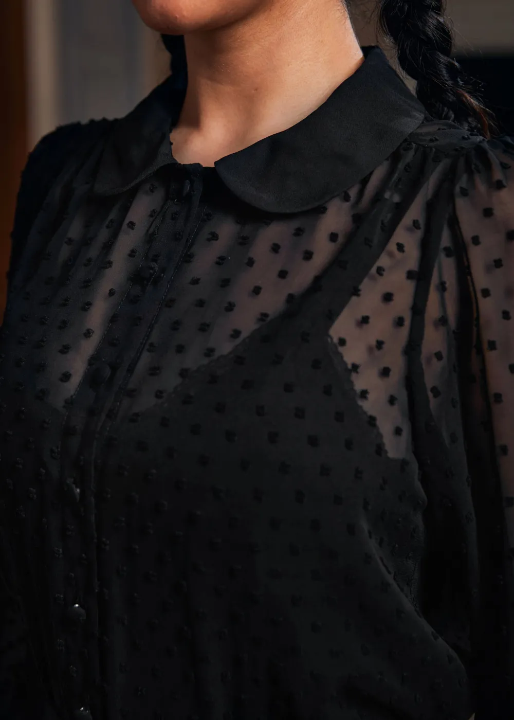 More Mulled Wine Collared Blouse from our ModCloth namesake label weaves the elegance of frosty mornings into a sophisticated chiffon piece. This black blouse, featuring functional buttons and made from short pile point fabric, captures the crisp, cool essence of fall while ensuring you stay warmly stylish. Whether leading a boardroom meeting or composing poetry in a secluded cabin, this blouse is an anthem to the quiet power of autumn.