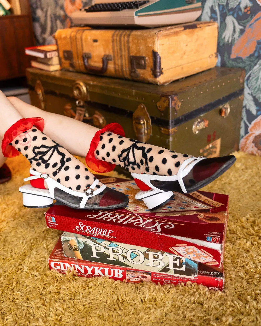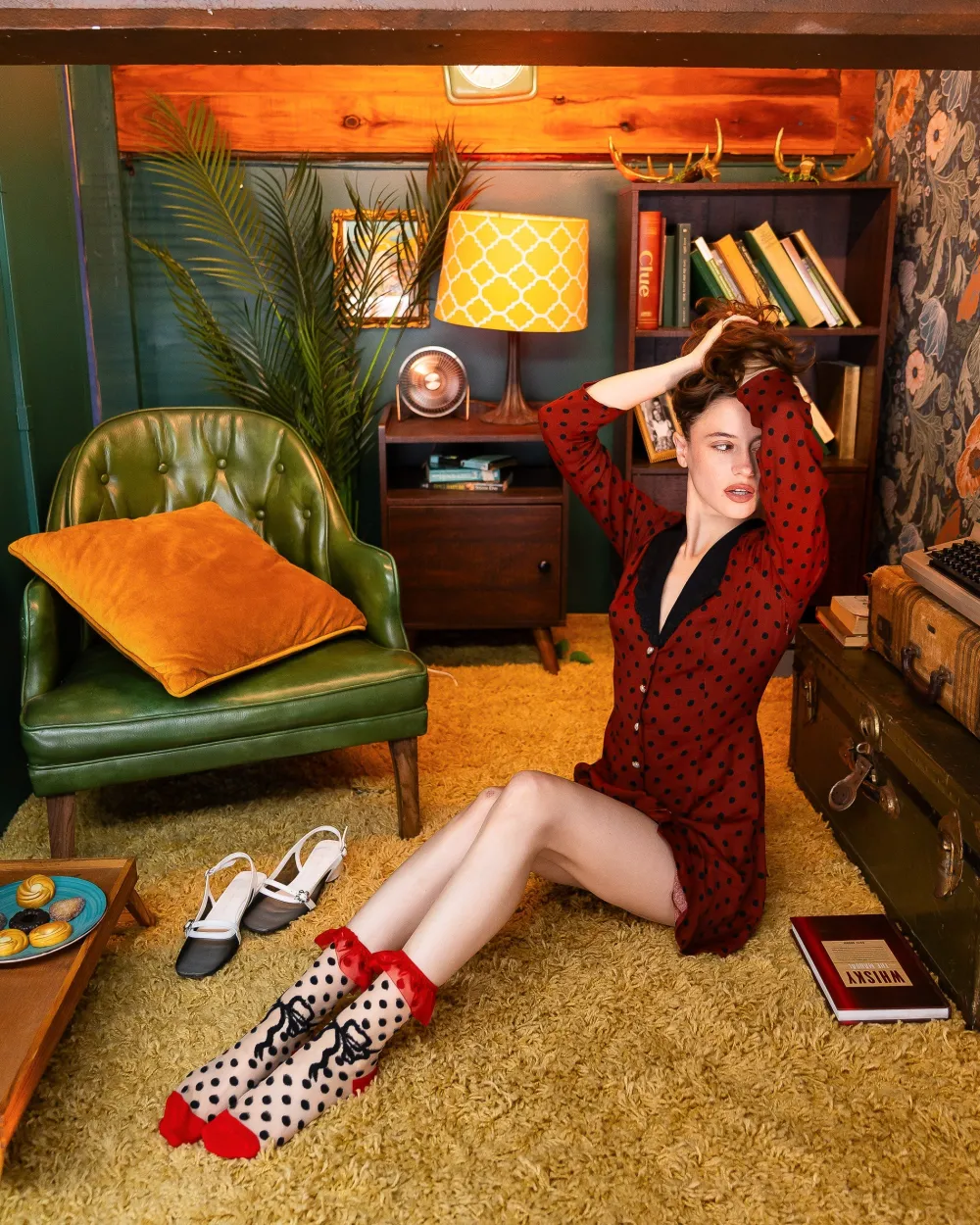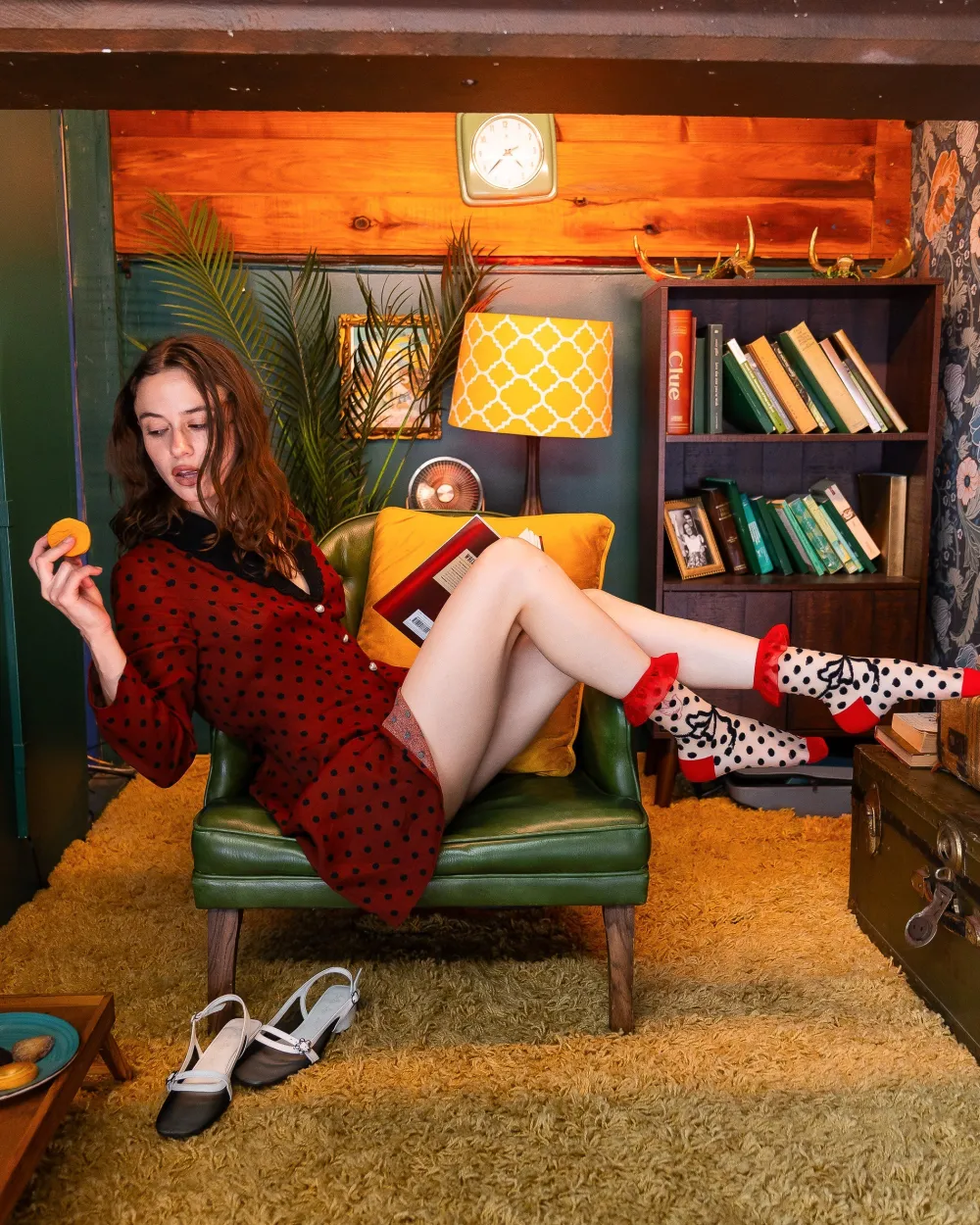 Our Polka Dot Bow Ruffle sheer sock is not your average polka dot sock. We added the Sock Candy touch with an unexpected oversized bow and red ruffle cuff, while keeping the colors classic in black and red. This sock brings old Hollywood meets coquette-core energy to your wardrobe.