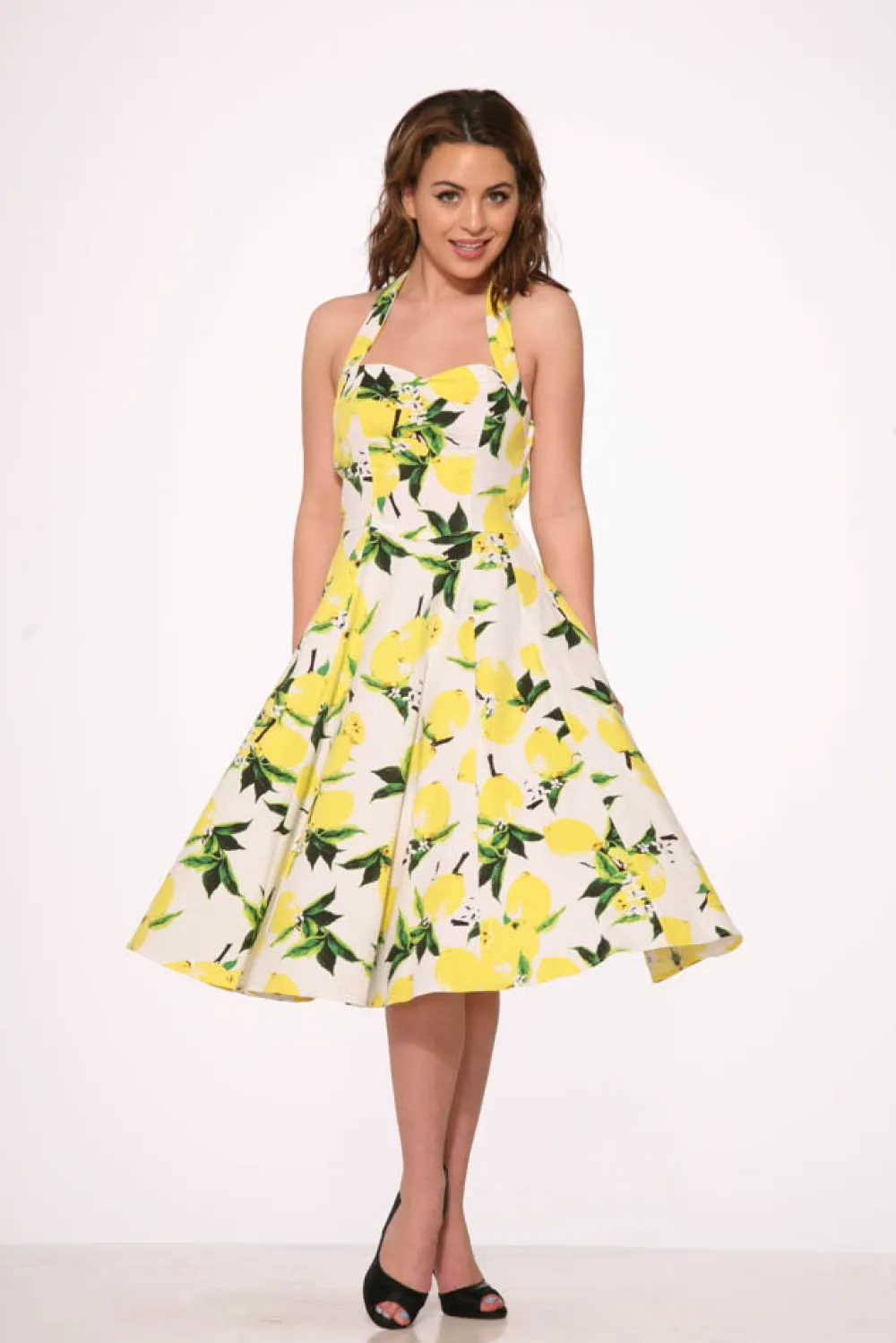 When life gives you lemons—wear them! The Orchid Bloom White Lemon Halter Swing Dress is a zesty, vintage-inspired stunner featuring a fresh lemon print on a crisp white backdrop. With its flattering halter neckline and full swing skirt, this dress brings a burst of sunshine to every twirl. The cotton-spandex blend ensures a sweet and comfortable fit, perfect for picnics, parties, or just brightening your day.