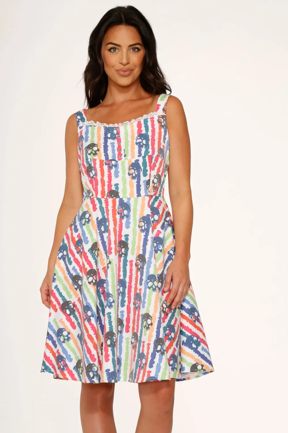 Bring bold energy and a splash of color to your twirl with the Orchid Bloom White Skulls Rainbow Swing Dress! Featuring a playful print of vibrant rainbow skulls against a crisp white backdrop, this retro-inspired fit-and-flare is a perfect mix of sweet and rebellious. Crafted from a comfy cotton-spandex blend, it’s ready for sunshine, smiles, and making a statement wherever you go.